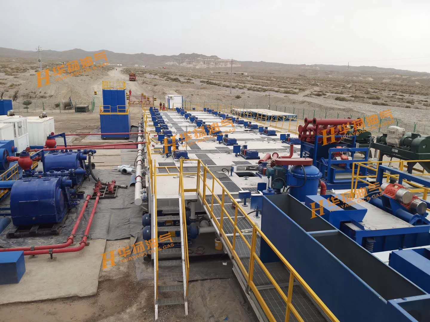 ZJ70-4500DBL鉆機(jī)配套固控系統(tǒng),包括了11具泥漿罐、HYZS703三聯(lián)振動篩、HYZCQ270真空除氣器、HYQJ250X3S-100X16N除泥除砂一體機(jī)、HYLW600中速離心機(jī)、HYLW350-1N高速離心機(jī)、HYJBQ15攪拌器、HYSLH150-50雙加重系統(tǒng)、HYJQH150-50剪切混漿系統(tǒng)等設(shè)備。